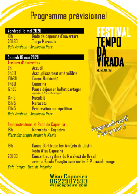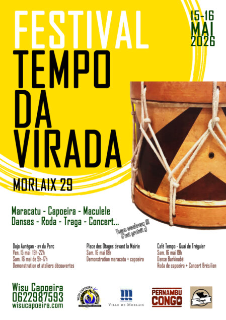 VIRADA du verbe brésilien virar, « tourner, changer ». Le temps de deux jours, les 15 et 16 mai, les associations WISU CAPOEIRA et PERNAMBUCONGO s’unissent pour faire vibrer la ville de Morlaix et ses habitants aux sons du Brésil ! Leozinho, responsable de l’événement et de l’association Wisu Capoeira explique : « Nous voulions créer un moment où la ville de Morlaix change de rythme et où tout devient beaucoup plus intense : plus de son, plus de mouvement, plus de monde, plus de force, plus de rythme, plus de joie ! ». C’est le sens de la «Virada » qui désigne ce moment très spécial dans le cortège musical des tambours brésiliens où certains tambours prennent leur envol en créant la surprise. « Tempo da virada » c’est ce moment où le rythme change, où tout devient possible. Un moment plus intense et créatif où l’on sort du quotidien.